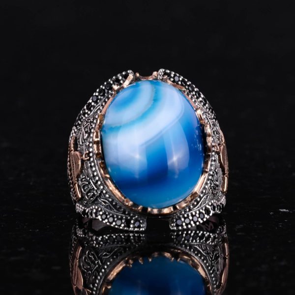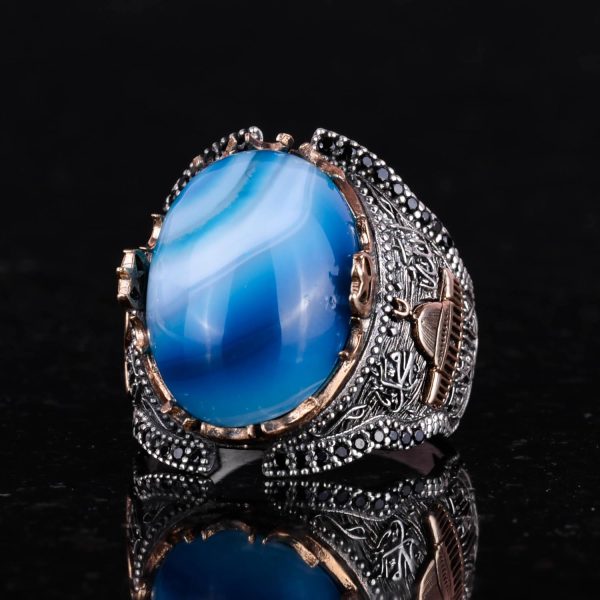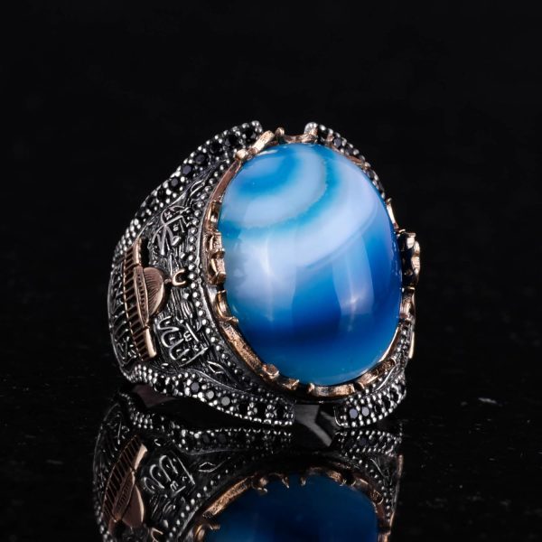 Mavi Akik Taşlı Yüzük, Camii Yüzüğü, 925 Ayar Gümüş Yüzük