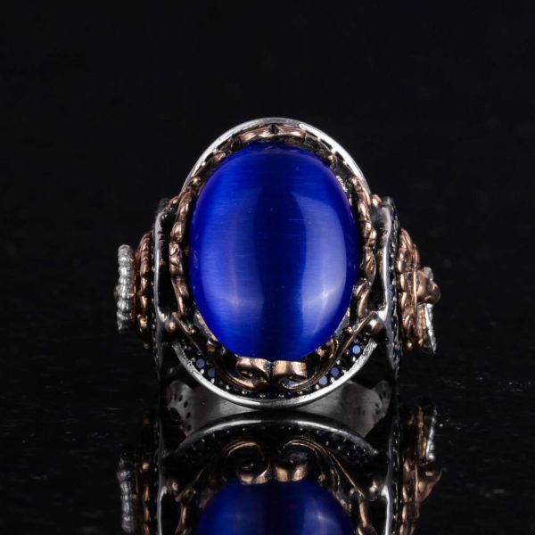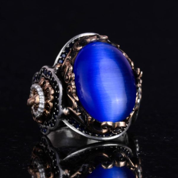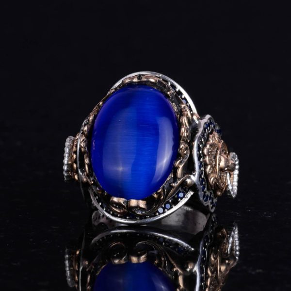 Mavi Kedi Gözlü Taş Yüzük, Aslan Sembolü Erkek Yüzüğü, 925 Ayar Gümüş Tasarım Erkek Yüzüğü