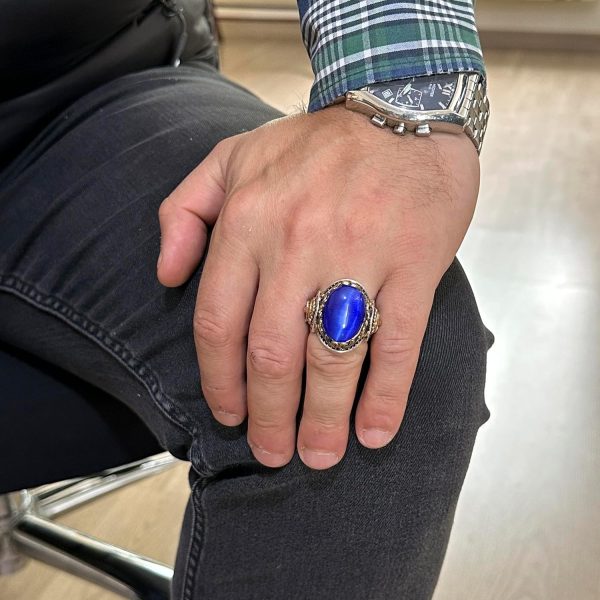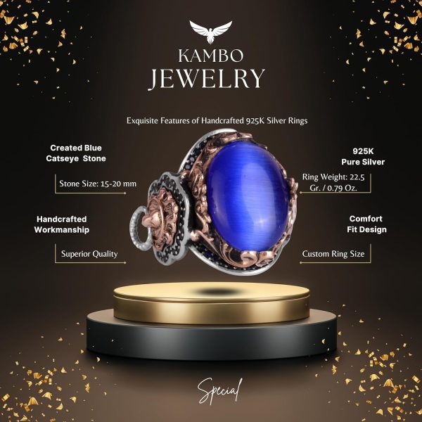 KAMBO Mavi Kedi Gözü Yapay Taş Yüzük – Bu eşsiz erkek yüzüğü koleksiyonunuza dahil edin, 925K gümüş ile tasarlanmış ve büyüleyici Mavi Kedi Gözü yapay taşı ile süslenmiş aslan sembolü ile birlikte.