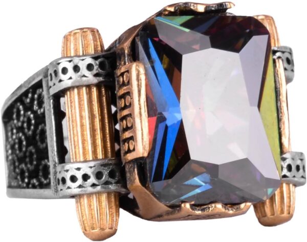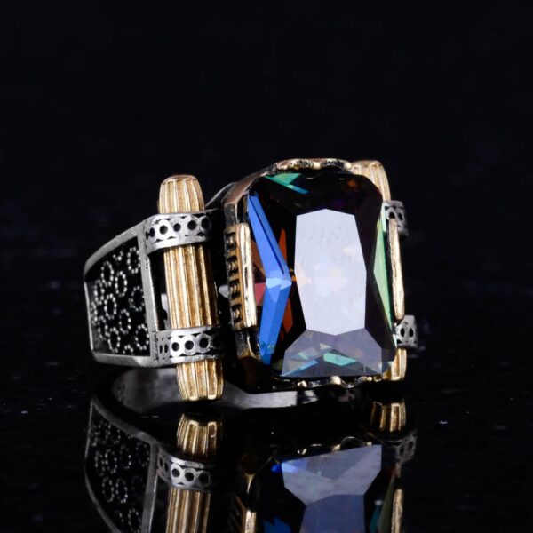 Yapımı Mistisizm Topaz Taşı: Bu yüzüğün merkezinde, canlı çok renkli parlaklığıyla tanınan yapımı mistisizm topaz taşı yer alıyor. Mistisizm topazı, yaratıcılığı ve pozitifliği sembolize etmesiyle bilinir, bu da onu takılarında güzellik ve zarafet arayanlar için mükemmel kılar.