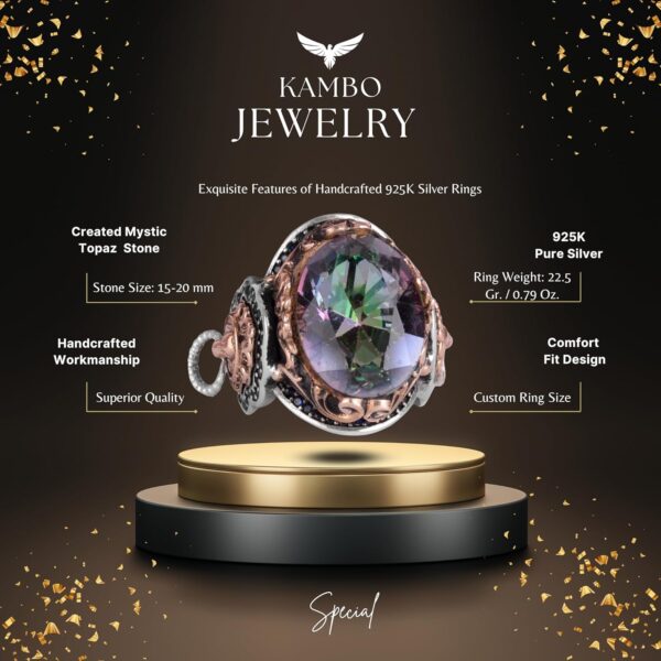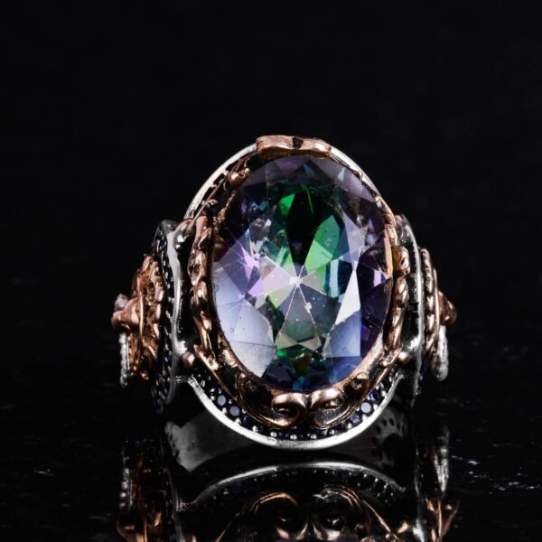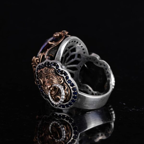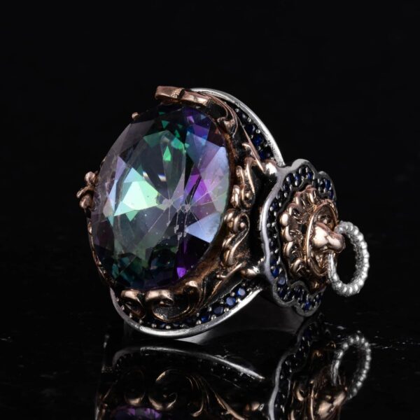Mistik Topaz Yapay Taş Yüzük, Aslan Başı Erkek Yüzüğü, 925 Ayar Gümüş Yüzük, Tasarım Gümüş Erkek Yüzüğü