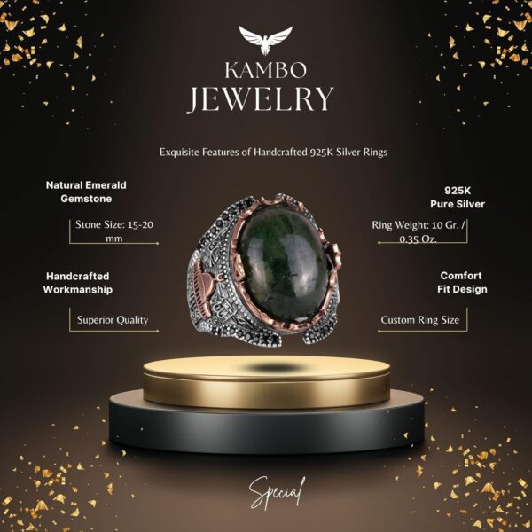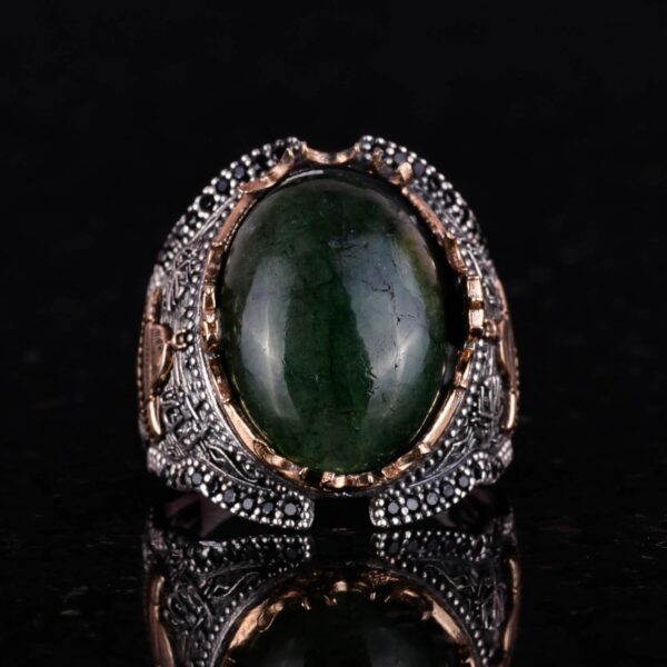 Mescidi Aksa desenli, Cabochon Zümrüt Taşlı Yüzük, 925 Ayar Saf Gümüş Erkek Yüzüğü