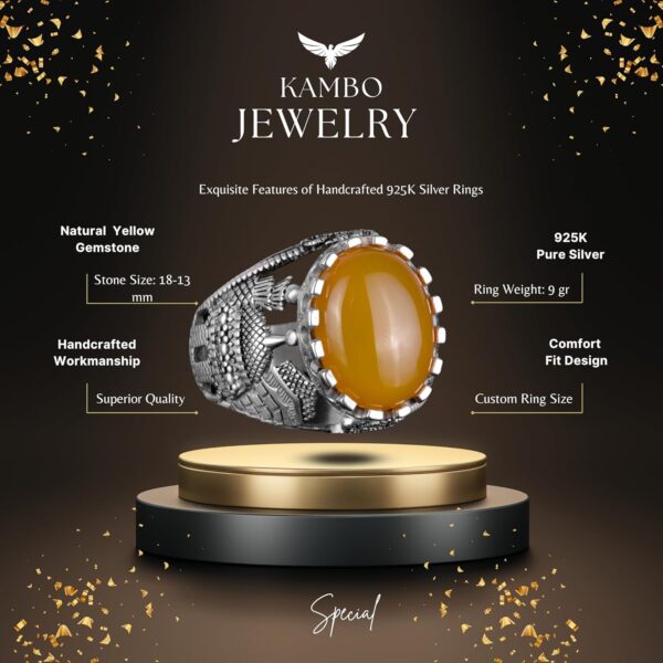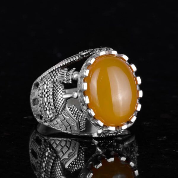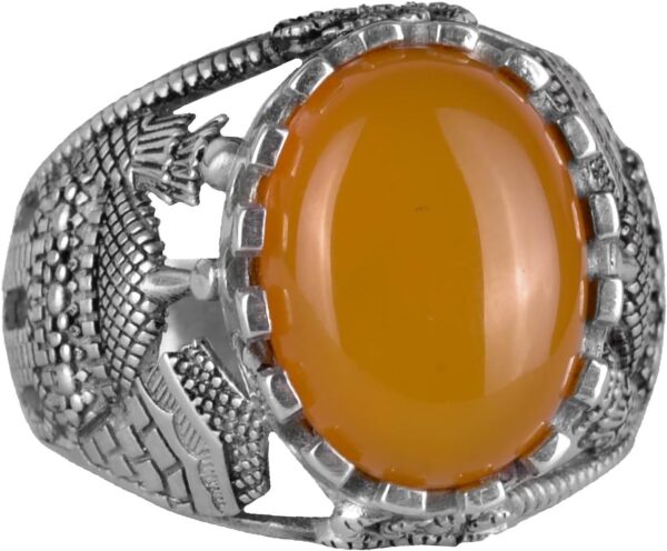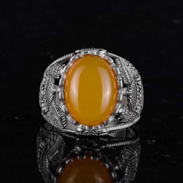 Doğal Sarı Akik Taş Yüzük, 925 Ayar Sert Gümüş İslami Yüzük Erkekler İçin