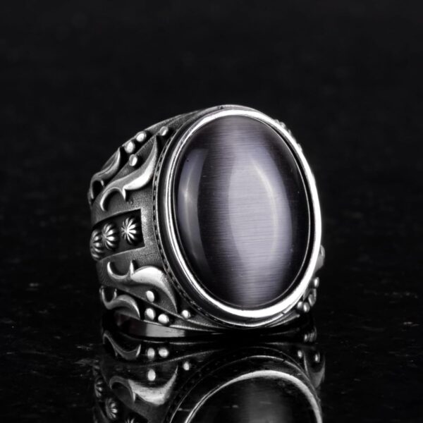 Oluşturulmuş Taş Yüzük, 925 Ayar Gümüş Yüzük, Tasarım Gümüş Erkek Yüzük (Siyah Catseye Oluşturulmuş Taş)