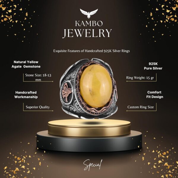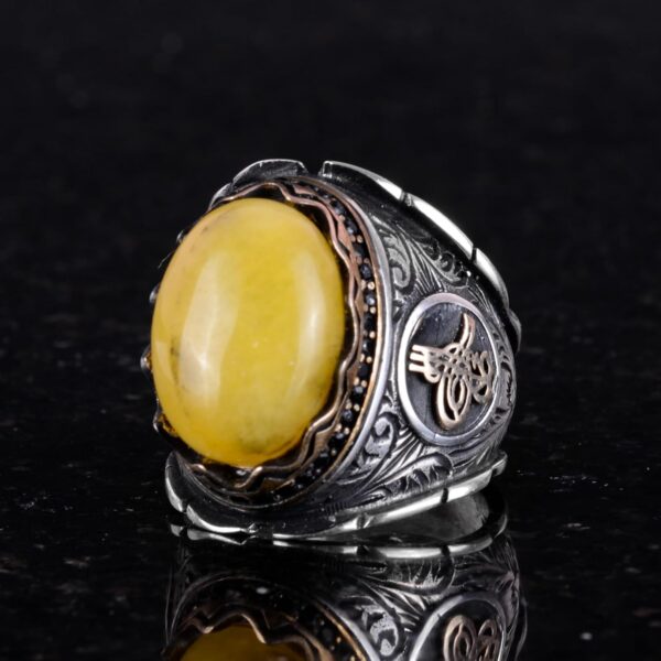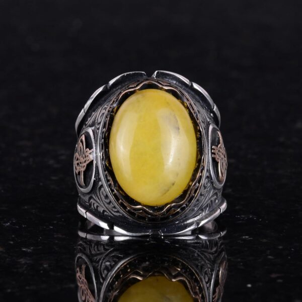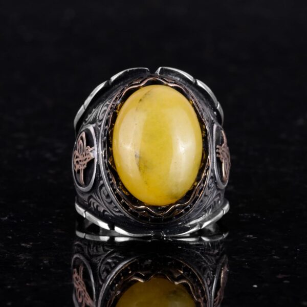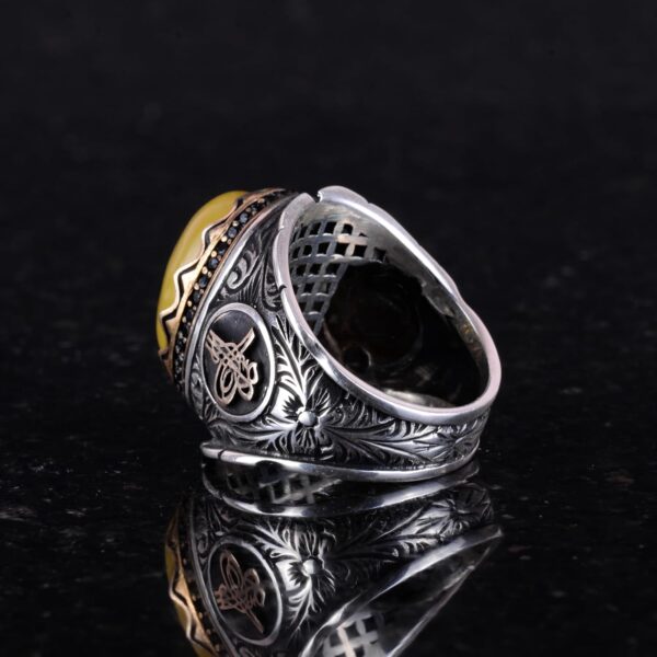 Osmanlı Tuğra Gümüş Yüzük, Doğal Sarı Akik Taşlı Yüzük, 925 Ayar Gümüş Yüzük Erkekler İçin