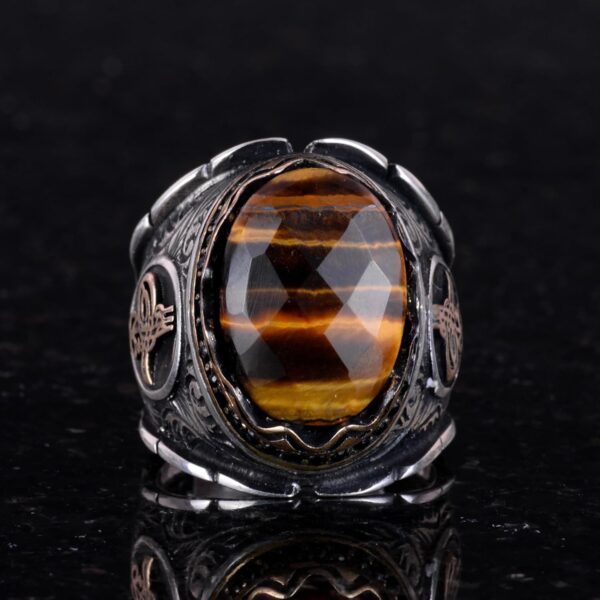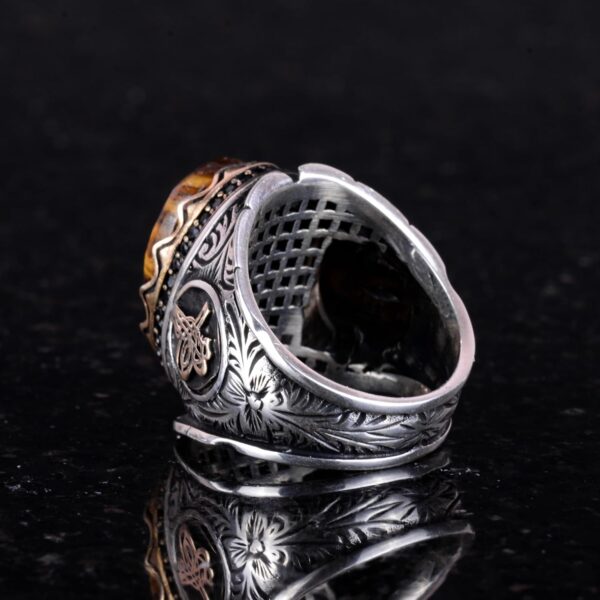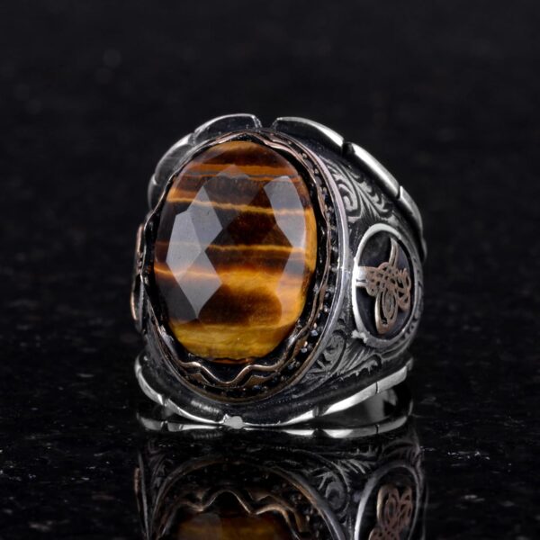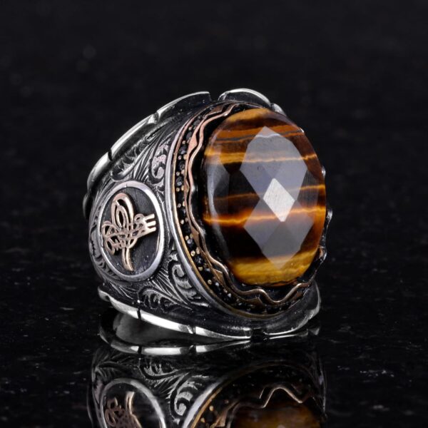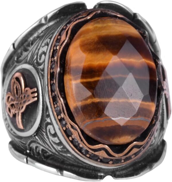 Osmanlı Tuğra Gümüş Yüzük, Doğal Taş Yüzük, 925 Ayar Gümüş Erkek Yüzük (Kaplan Göz)