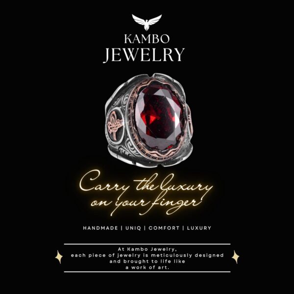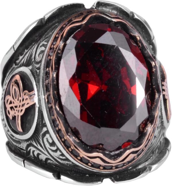Osmanlı Tuğra Gümüş Yüzük, Oluşturulmuş Granat Taşlı Yüzük, 925 Ayar Gümüş Yüzük