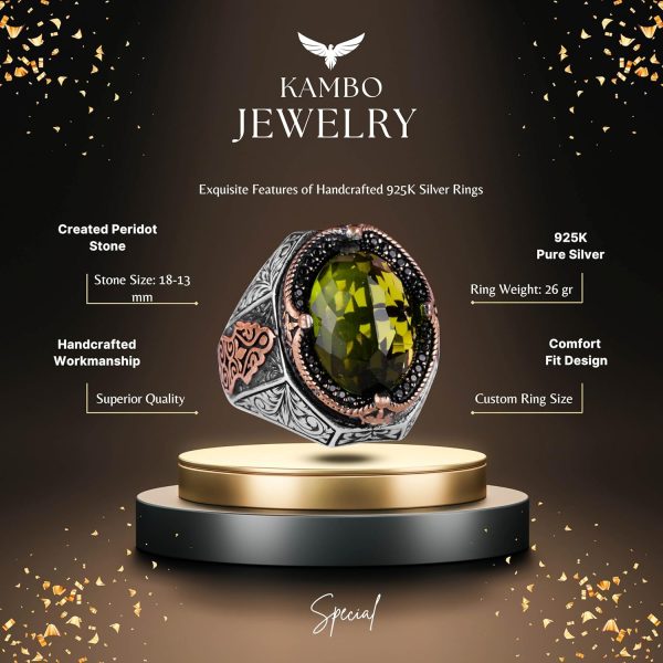 Özgün Tasarım: KAMBO, 925K gümüşte yer alan bir yapay peridot taşına sahip etkileyici bir el yapımı yüzük sunuyor. Bu yüzük, zarif ve anlamlı takı parçalarını sevenler için mükemmeldir.