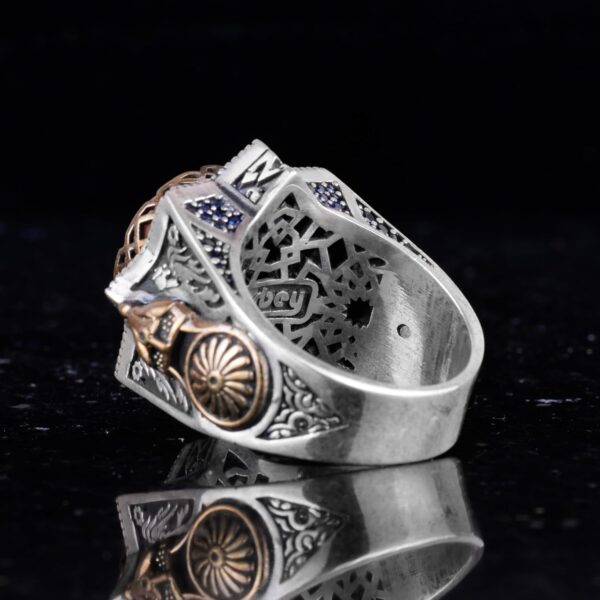 Bu muhteşem yüzük, güzel bir şekilde işlenmiş 925 ayar gümüş bant içinde yer alan canlı doğal kırmızı ağaç taşıyla dikkat çekiyor. Yüzüğün öne çıkan özelliği, taşın etrafını saran karmaşık detaylarla vintage ilhamlı yıldız tasarımıdır; bu da hem cesur hem de zarif bir parça oluşturur.
