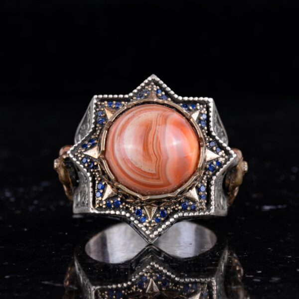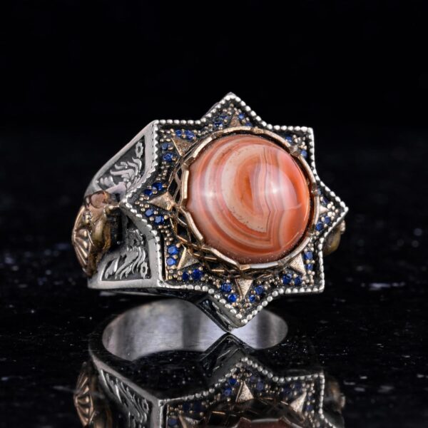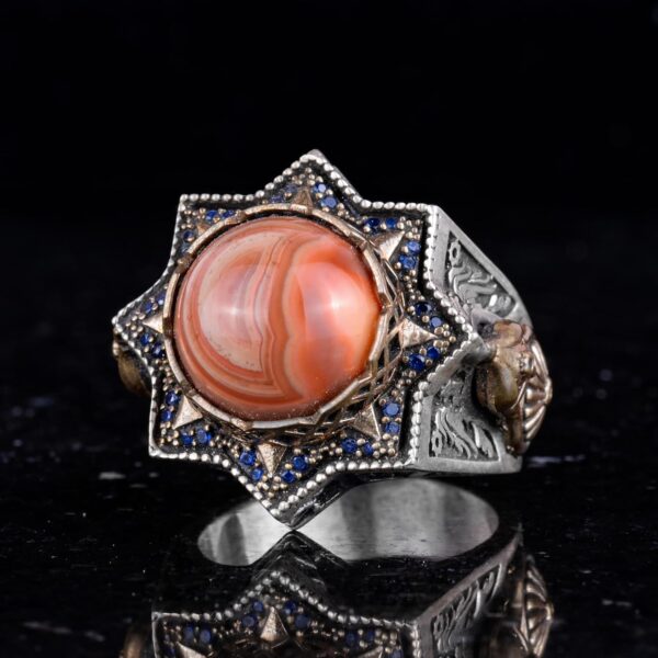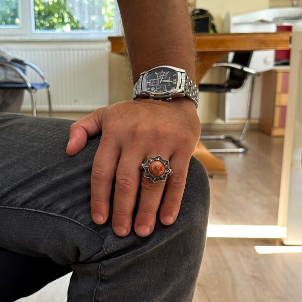 Sterling Gümüş Akik Taş Yüzük, Doğal Kırmızı Akik Erkek Yüzüğü, Vintage Yıldız Tasarımı
