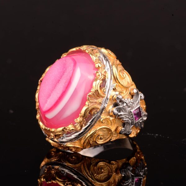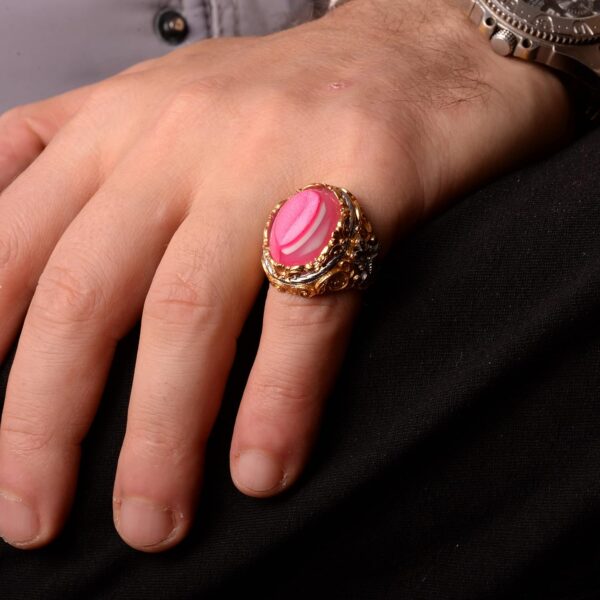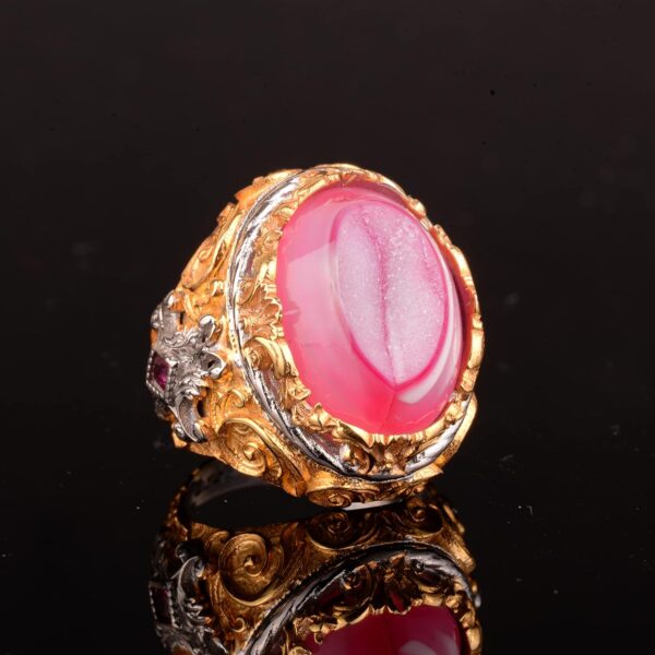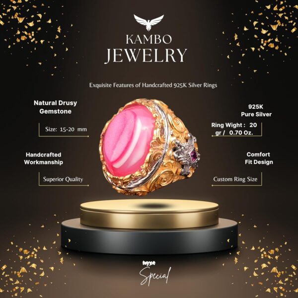 Gümüş Erkek Altın Kaplama Yüzük, Gerçek Kristal Druzy Kuvars Pembe Doğal Taş
