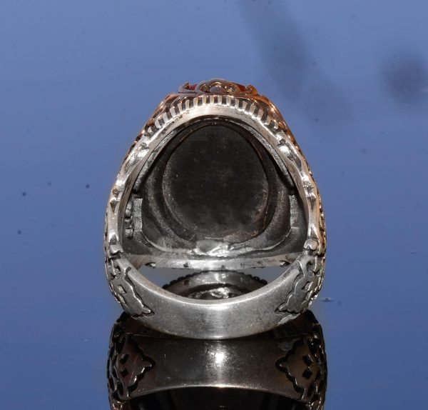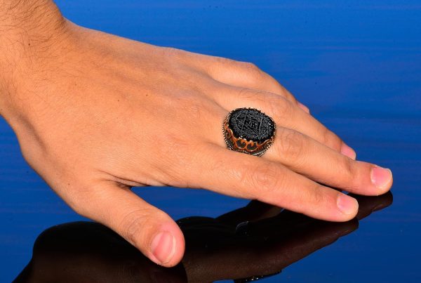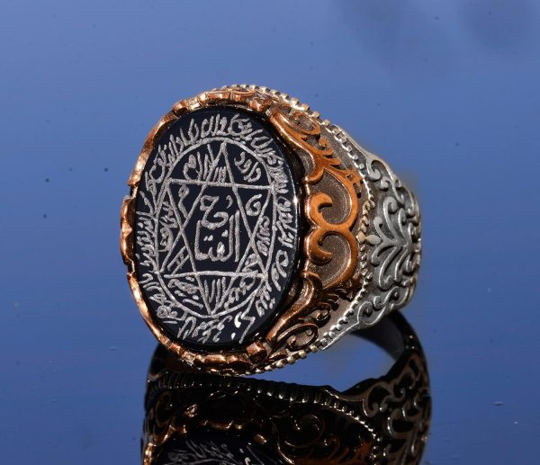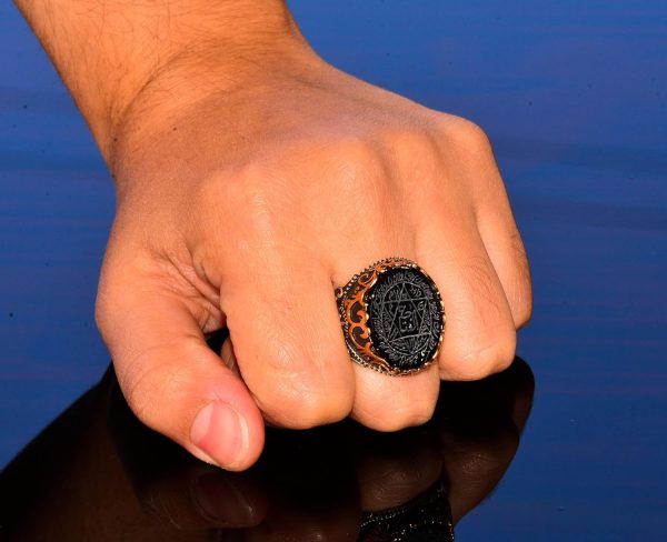 Bu zarif erkek yüzüğü, zamansız şıklığı ve gizemi ile tanınan gerçek bir siyah oniks taşına sahiptir. Taş, dayanıklılığı ve lüks bir görünümü garanti eden 925 ayar gümüş bir bant içine titizlikle yerleştirilmiştir. Yüzük, bilgelik, koruma ve ruhsal büyü sembolü olan güçlü Kral Süleyman Mührü ile süslenmiştir.