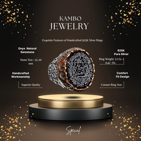 KAMBO 925 Ayar Gümüş Erkek Yüzüğü, Doğal Siyah Oniks Taşı, Kral Süleyman Mühürü Yüzüğü