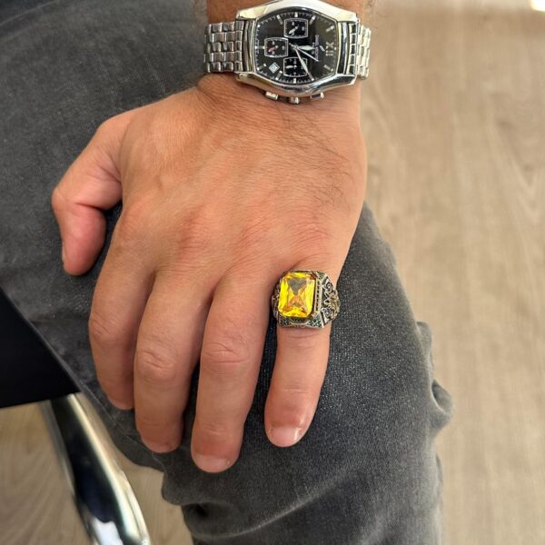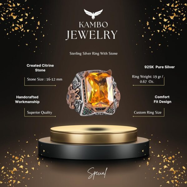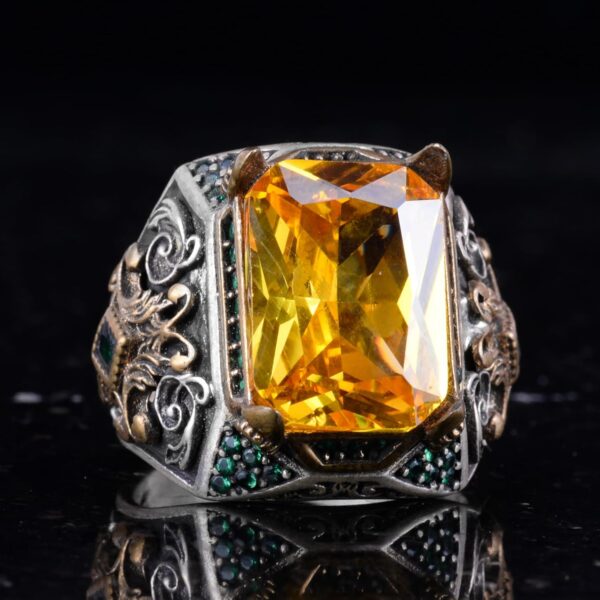 Sterling Gümüş Erkek Yüzük ile Yapay Sitrin Taşı – Vintage Tasarım – El Yapımı İfadesel Yüzük