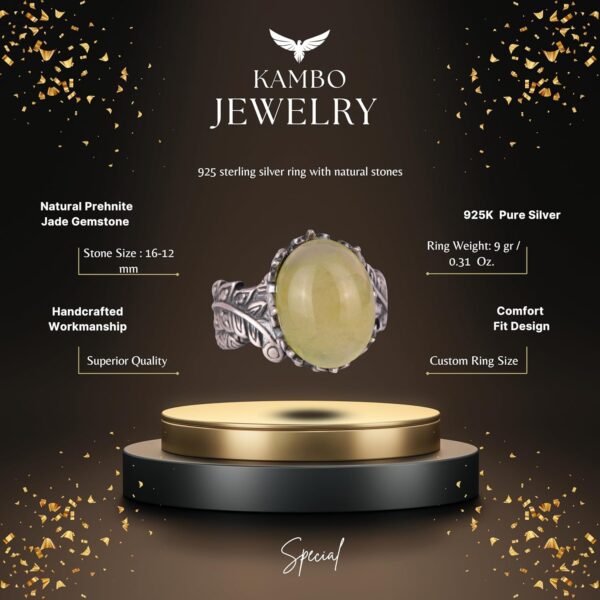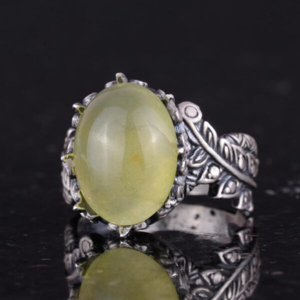 Prehnite jade, iyileşme, koruma ve iç huzur ile ilişkileri ile bilinir; bu nedenle bu yüzük, sadece güzel bir aksesuar değil, aynı zamanda bu niteliklerin anlamlı bir sembolüdür. Vintage tasarımı, el yapımı ve benzersiz takıları sevenler için mükemmel bir sanatsal dokunuş eklemektedir.
