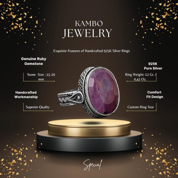 Bu muhteşem yüzük, dayanıklılık ve hipoalerjenik özellikler sunan 925 ayar gümüşten üretilmiştir; bu da onu günlük kullanım için uygun hale getirir. Yüzüğün merkezinde yer alan doğal yakut taşı, canlı kırmızı rengi ve doğal çekiciliği ile tanınmaktadır.