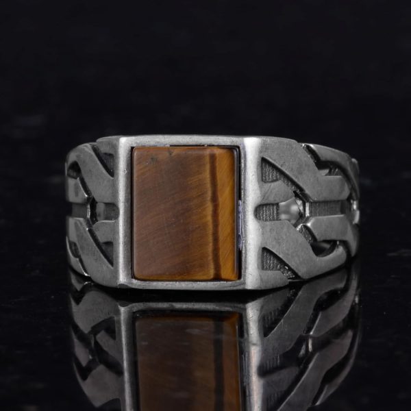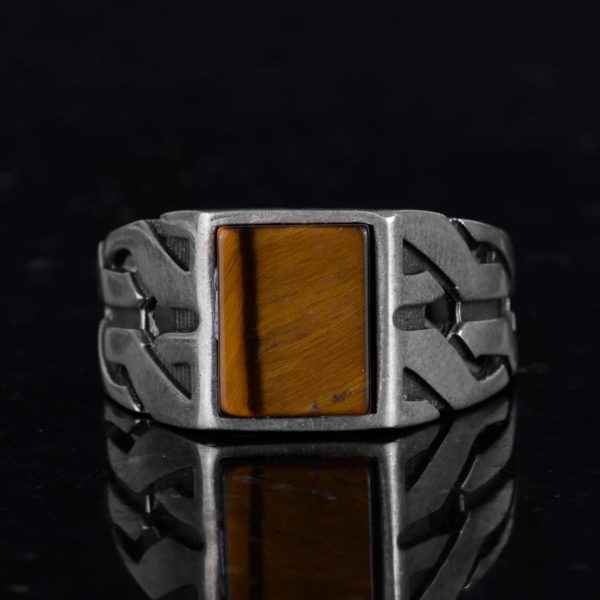 Bu olağanüstü yüzük, yüksek kaliteli gümüşten yapılmıştır ve sonsuzluğu ve gücü simgeleyen zamansız bir Yunan Anahtarı desenine sahiptir. Yüzük, topraklama ve güçlendirme özellikleriyle bilinen çarpıcı oluşturulmuş Kaplan Gözü taşıyla daha da zenginleştirilmiştir.