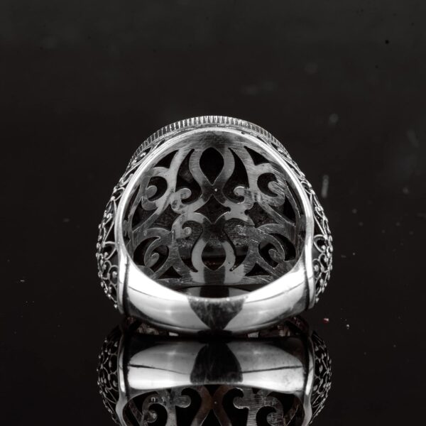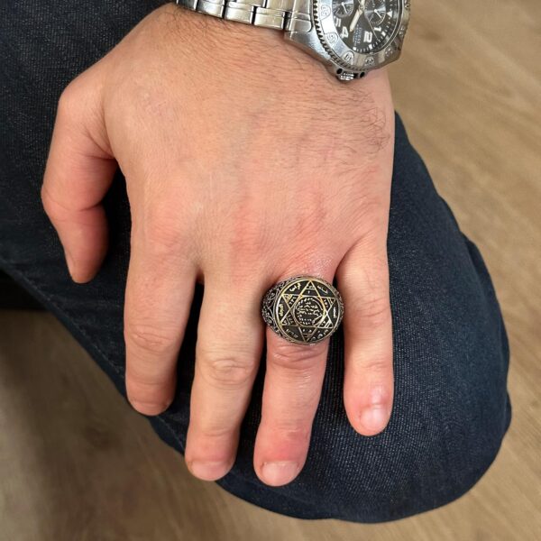Tanıtımını yaptığımız İsrafil Yüzüğü, Vintage Yüzük, 925 Ayar Gümüş Yüzük, tarihi sembolizmi modern zanaat ile birleştiren dikkat çekici bir parçadır. Bu yüzük, bilgelik ve koruma ile ilişkilendirilen bir sembol olan İsrafil Mührü’nü içermektedir.
