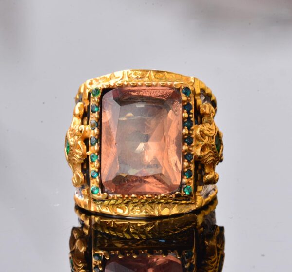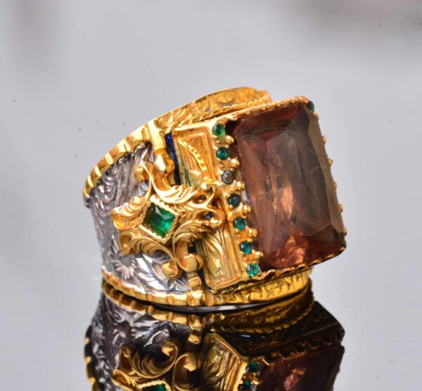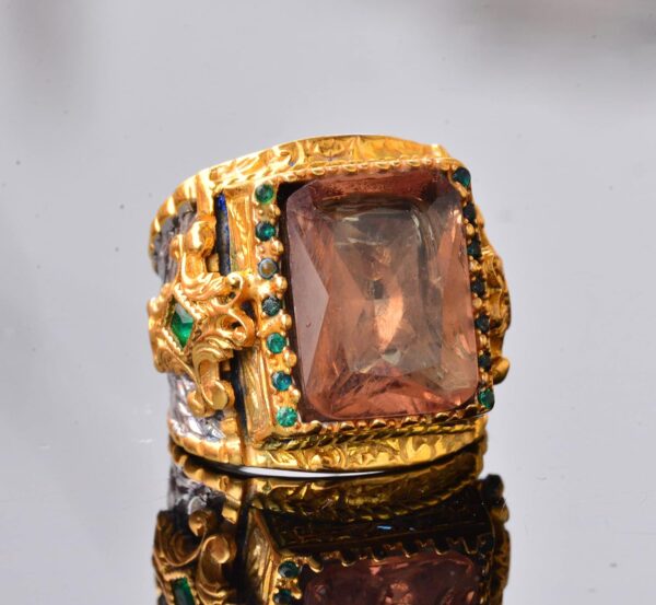 Bu yüzük, karmaşık detaylar ve ek yeşil ve mavi taşlar içermekte olup, her kıyafete zarafet ve sofistikelik katmaktadır. Detaylı işçilik, ince işlenmiş takıları takdir edenler için mükemmel bir parça olmasını sağlar.