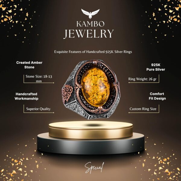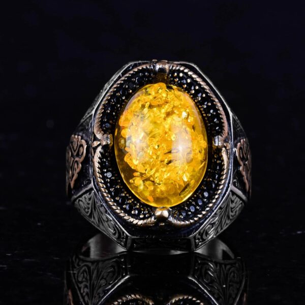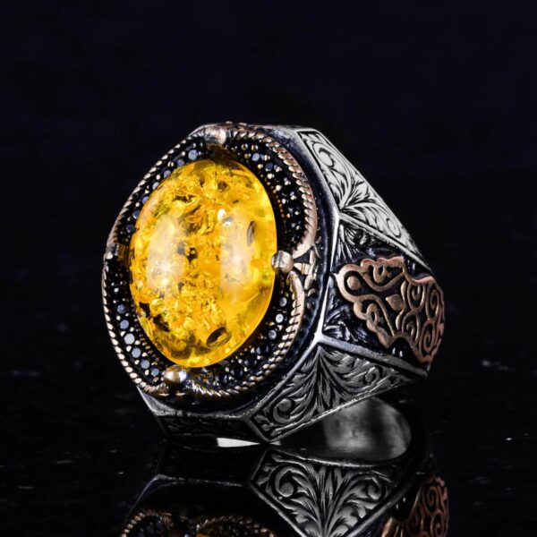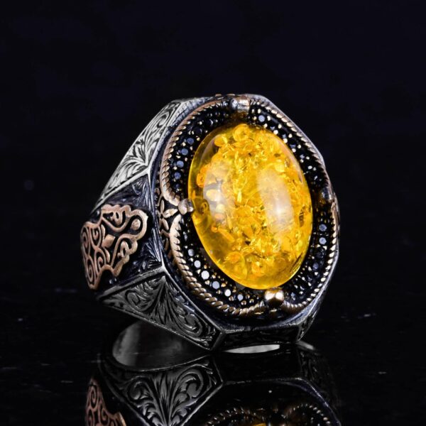 Şık El Yapımı 925 Ayar Gümüş Erkek Yüzüğü, Yapay Açık Sarı Amber Taşı)