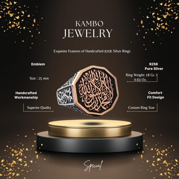 KAMBO Tawhid Yüzüğü ile inancınızı kucaklayın. Bu zarif tasarıma sahip büyük yüzük, “La ilaha illallah” yazılı etkileyici Arap hat sanatıyla işlenmiş bir tasarıma sahiptir ve Allah’ın birliğini, inancı ve manevi gücü sembolize eder. Yüksek kaliteli 925 ayar gümüşten üretilmiştir, bu yüzük hem dayanıklıdır hem de şık bir görünüm sunar, günlük kullanım veya özel günler için mükemmeldir.