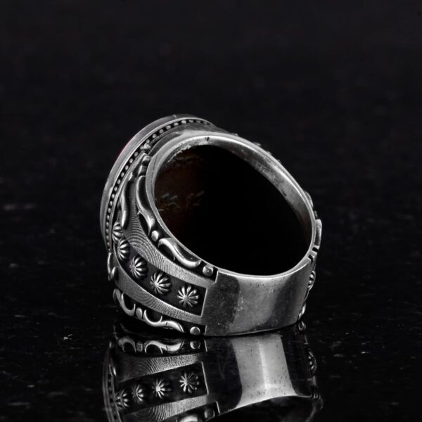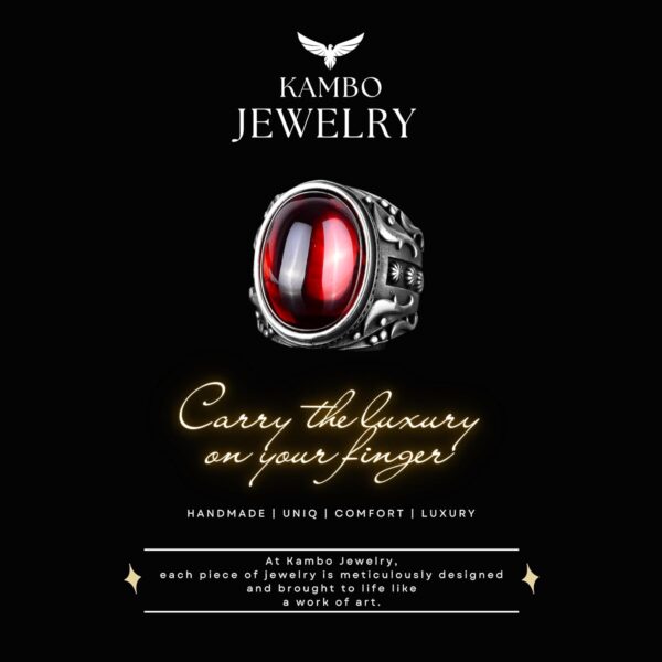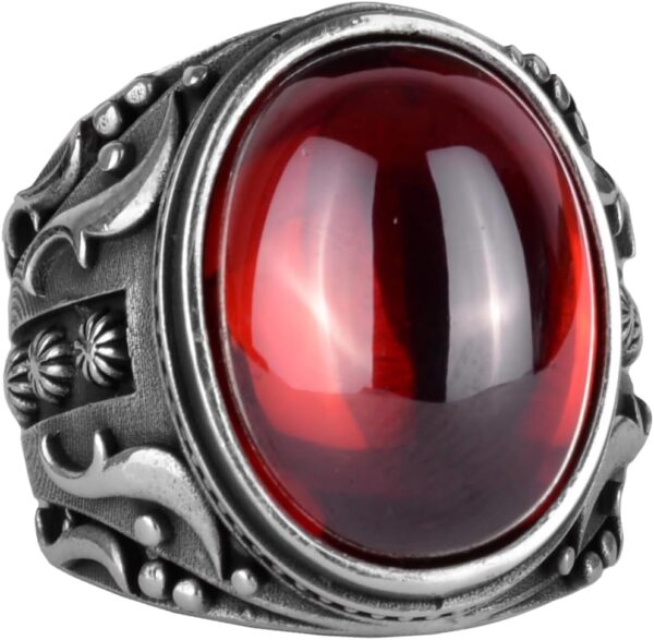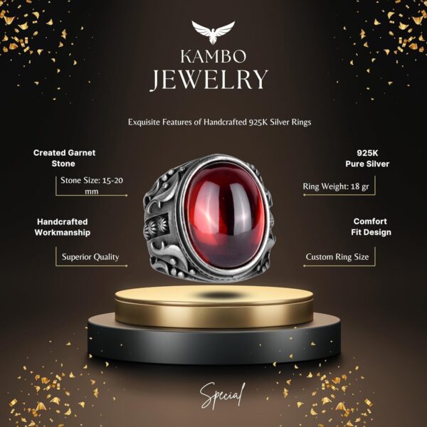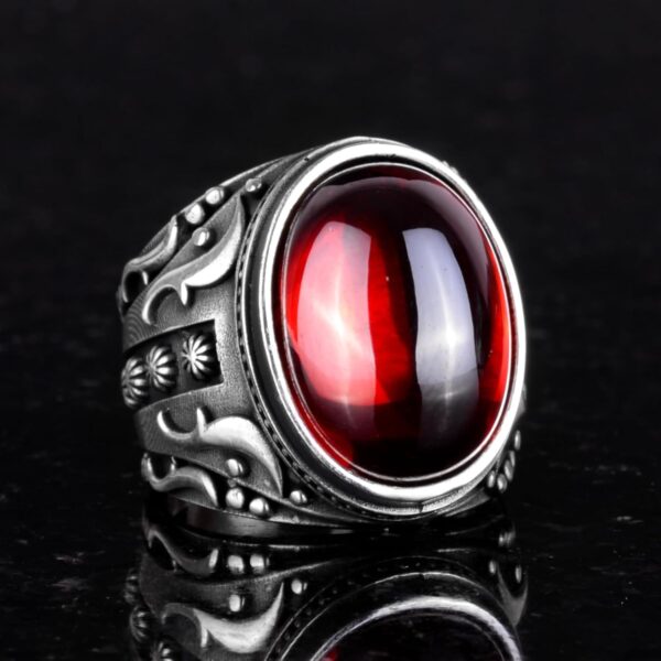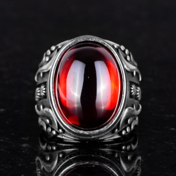 Üretilmiş Taş Yüzük, 925 Ayar Gümüş Yüzük, Tasarım Gümüş Erkek Yüzüğü (Cabochon Üretilmiş Granat Taşı)