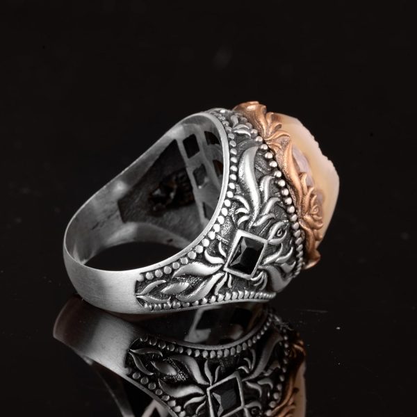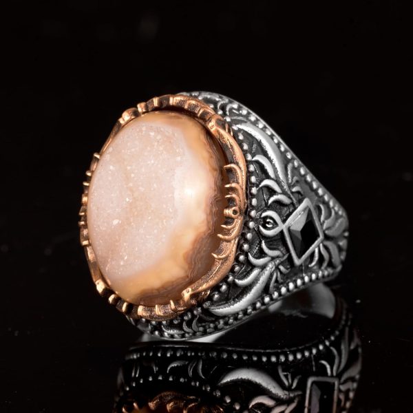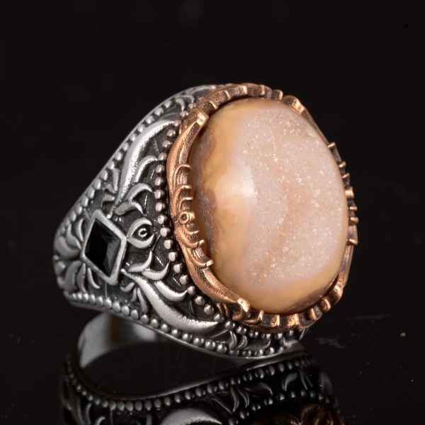 Vintage Erkek 925 Ayar Gümüş Yüzük Druzy Kuvars: Yeşil, Kırmızı, Lacivert, Bej, Siyah (Bej)