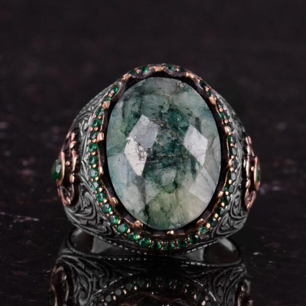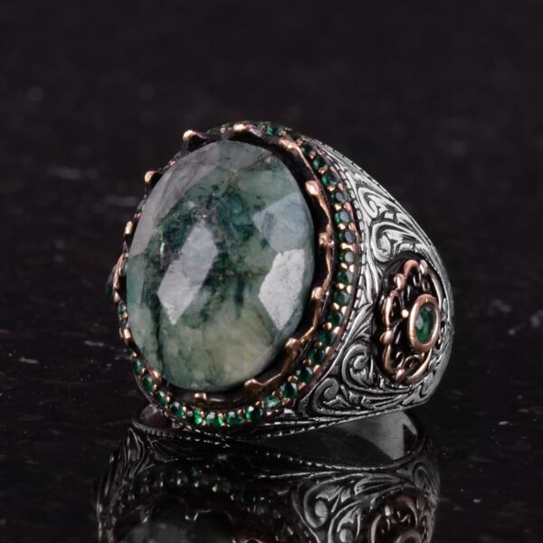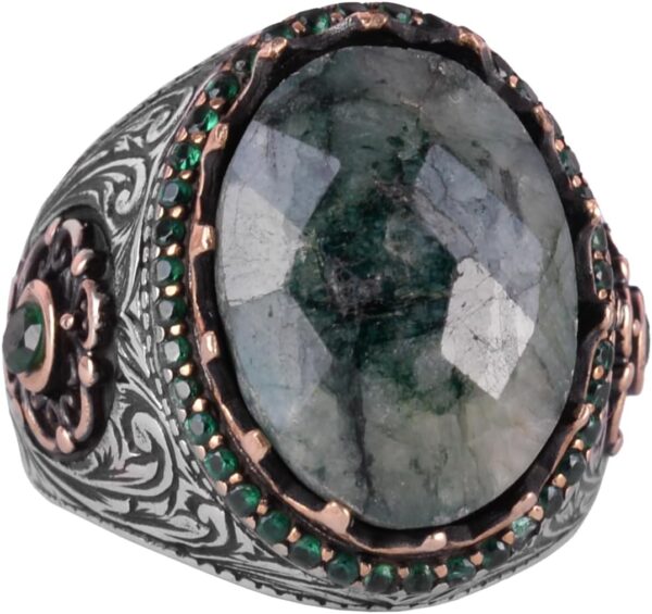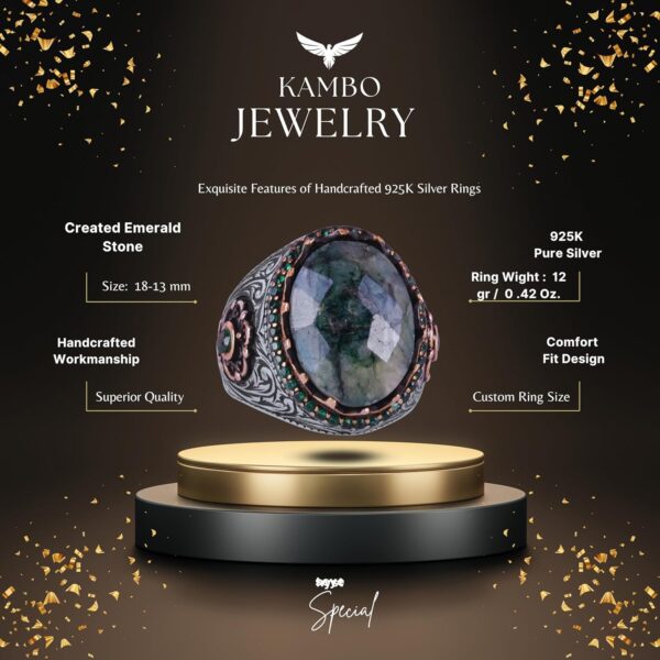 Eşsiz Tasarım: KAMBO, 925 ayar gümüş üzerine yerleştirilmiş bir yapay zümrüt taşına sahip etkileyici bir el yapımı yüzük sunuyor. Bu yüzük, şık ve anlamlı takı parçalarını sevenler için mükemmeldir.