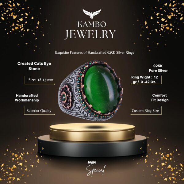 Eşsiz Tasarım: KAMBO, 925 ayar gümüş üzerine yerleştirilmiş bir yaratılmış kaplan gözü taşı içeren muhteşem bir el yapımı yüzük sunuyor. Bu yüzük, zarif ve anlamlı takı parçalarını takdir edenler için mükemmeldir.