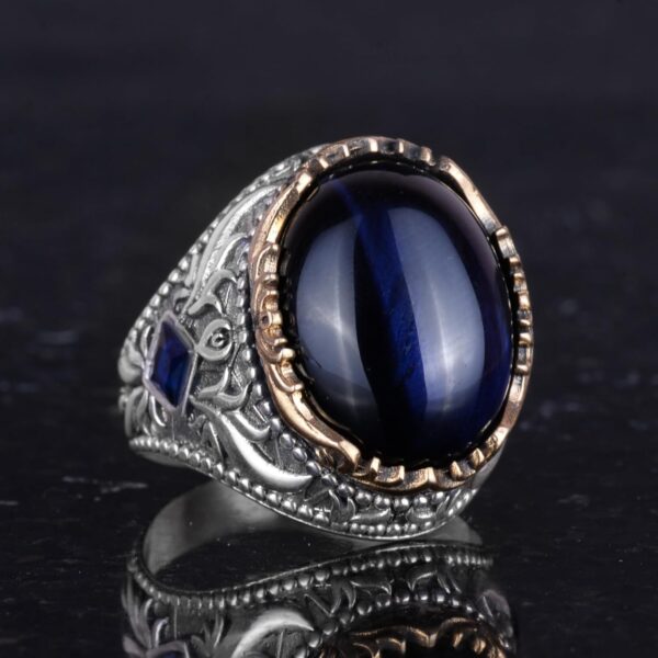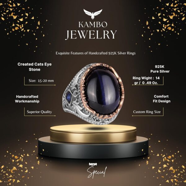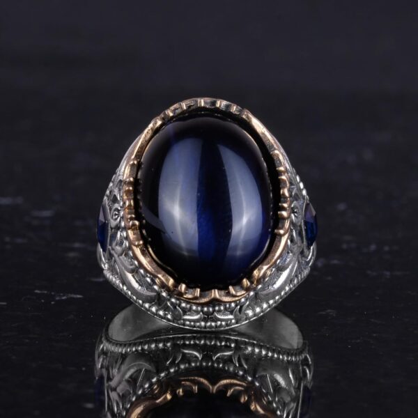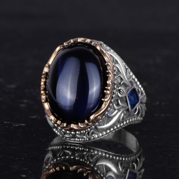 Yapay Taş Yüzük – El Yapımı Erkek Yüzüğü – Zarif 925 Ayar Gümüş Erkek Yüzüğü (Yapay Lacivert Kedi Göz)