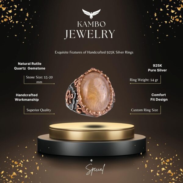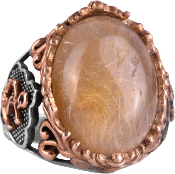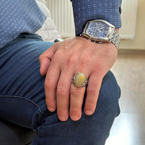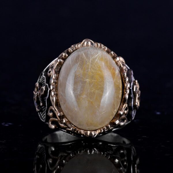 Yelkenci Çapa Yüzüğü, Cabochon Altın Rutilatlı Kuvars Taşlı Yüzük, 925 Ayar Katı Gümüş Erkek Yüzüğü