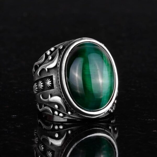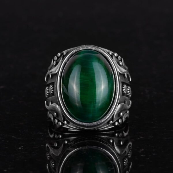 Yeşil Kedi Gözü Yapay Taş Yüzük, 925 Ayar Gümüş Yüzük, Tasarım Gümüş Erkek Yüzüğü